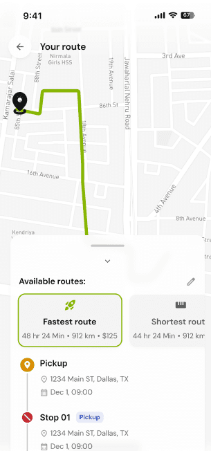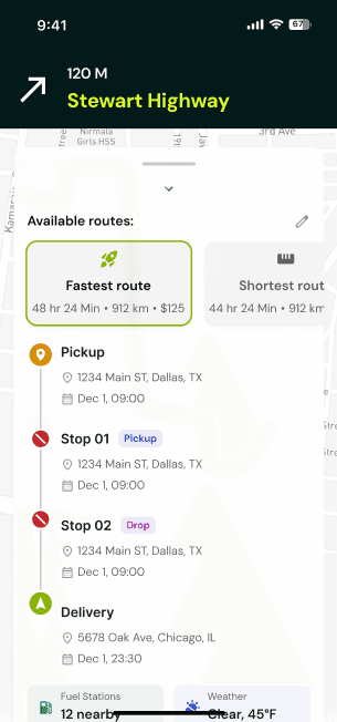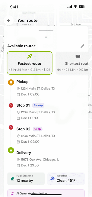 AI plans your route, cuts fuel and toll costs, and connects you with drivers nearby.