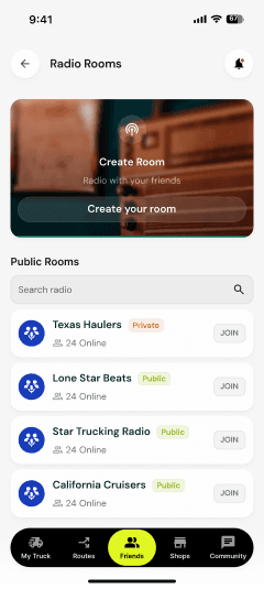 Voice rooms by route and region. No CB hardware needed.